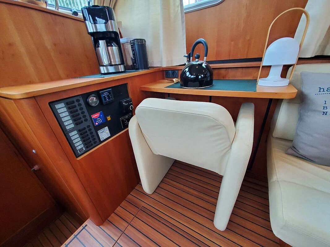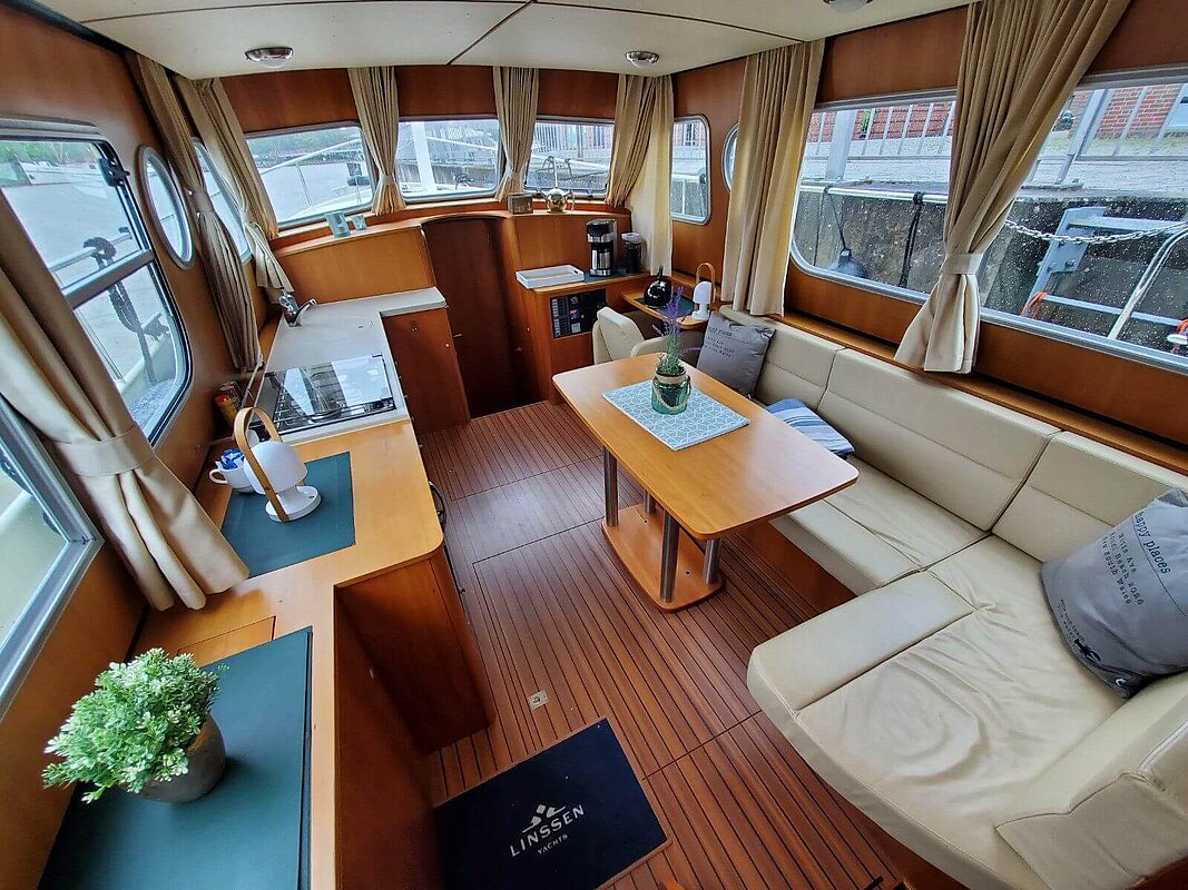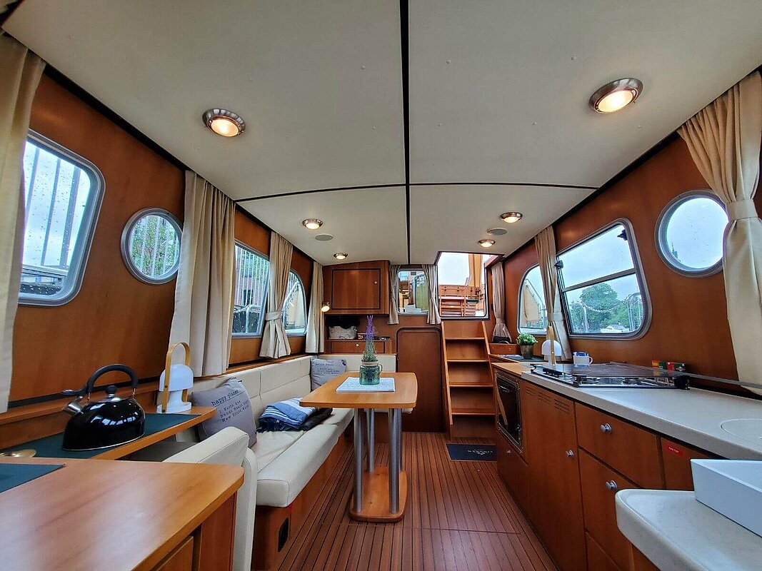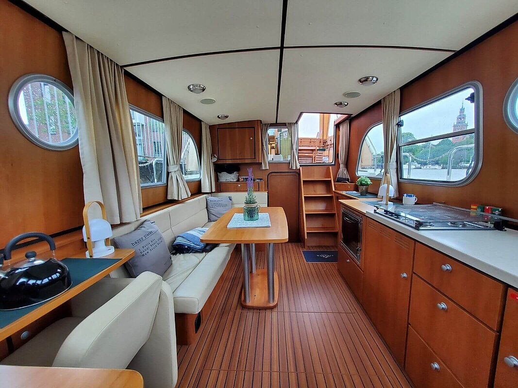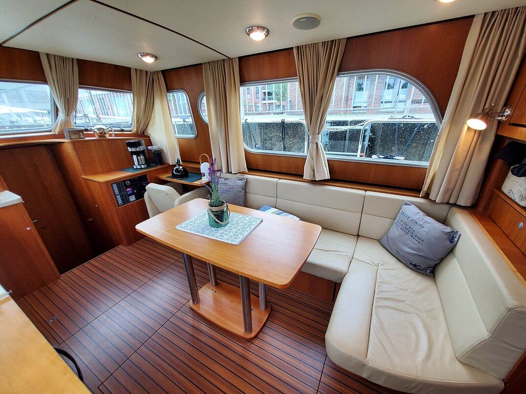 Der Salon ist geräumig und bietet mit separatem Keller viel extra Stauraum. Die Sitzbank kann in ein Gästebett umgebaut werden, sodass bis zu sechs Personen einen Schlafplatz finden. Das große, neue Cabrioverdeck umschließt den kompletten Bereich und schützt so vor Regen, Wind oder bietet angenehmen Schatten. Zwei große, mobile Backskisten mit Polstern bieten Sitzplätze und Stauraum.