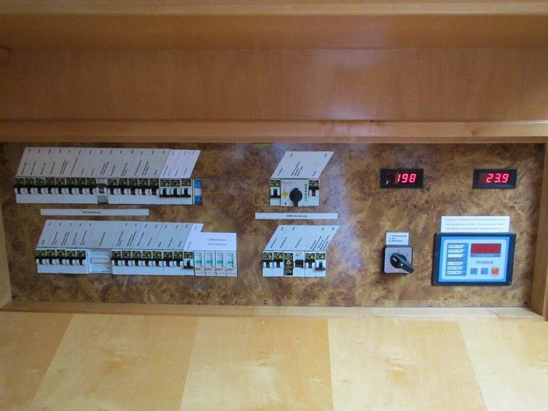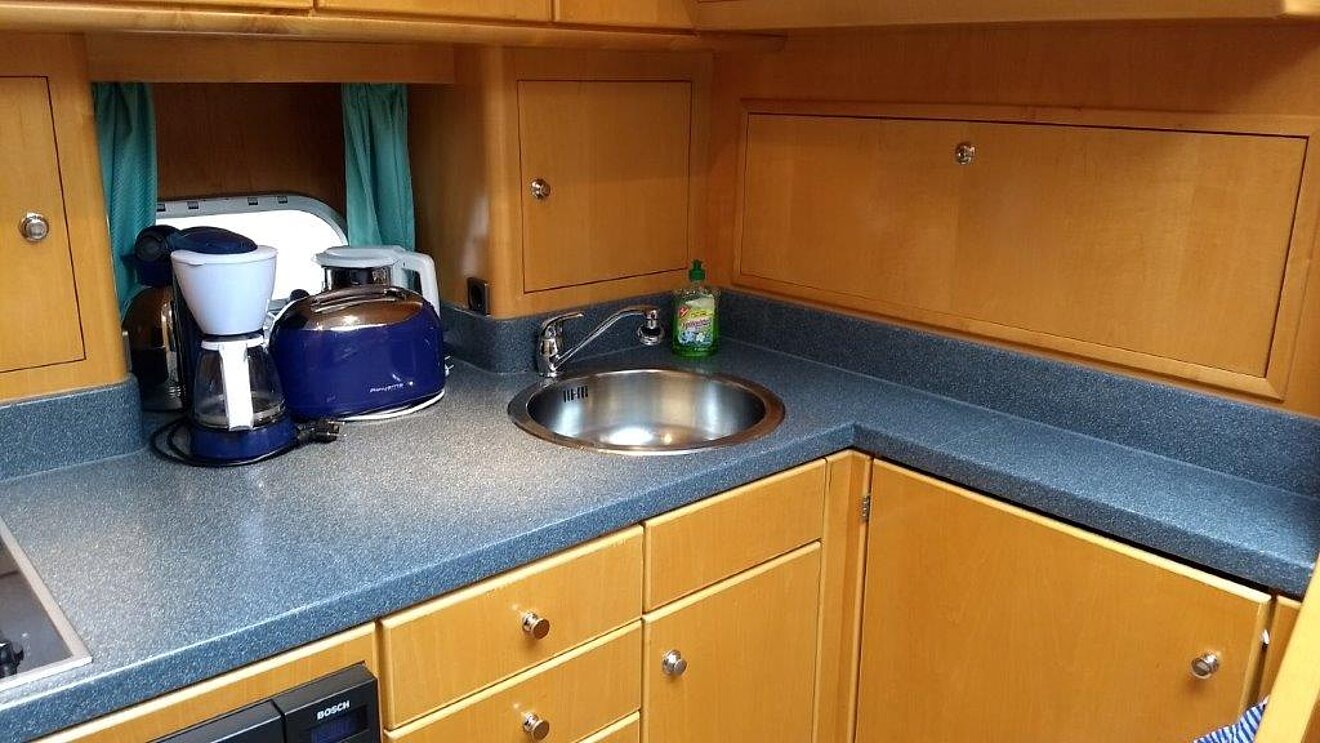 Heizung, Generator, Batterien und Ladegeräte, Landanschluß, Boiler, E-Herd mit Glaskeramikfläche, Mikrowelle, Spüle, Kühlschrank, zweiter Kühlschrank in Gästekabine, Farbfernseher, Radio mit CD-Player, Innen- und Außenlautsprecher, automatischer Feuerlöscher im Motorraum, 2 Handfeuerlöscher, Rauchmelder, CO-Warnmelder, automatische Bilgepumpe, Fäkalientank