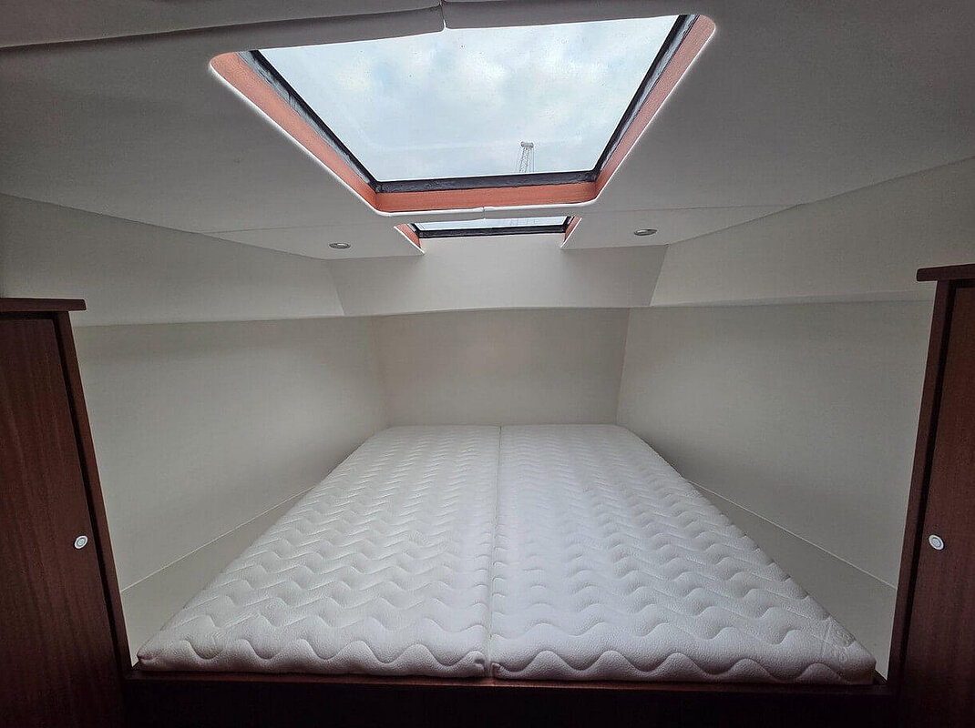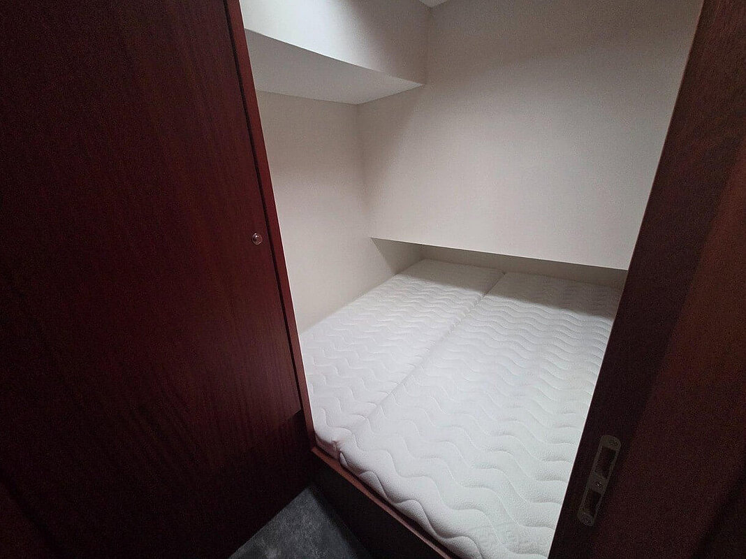2 Unterkunftsräume, Salon und Pantry kombiniert, Vorderkabine mit freistehendem Doppelbett, separate Gästekabine mit einem Bett, Nasszelle mit Dusche und elektrischem WC