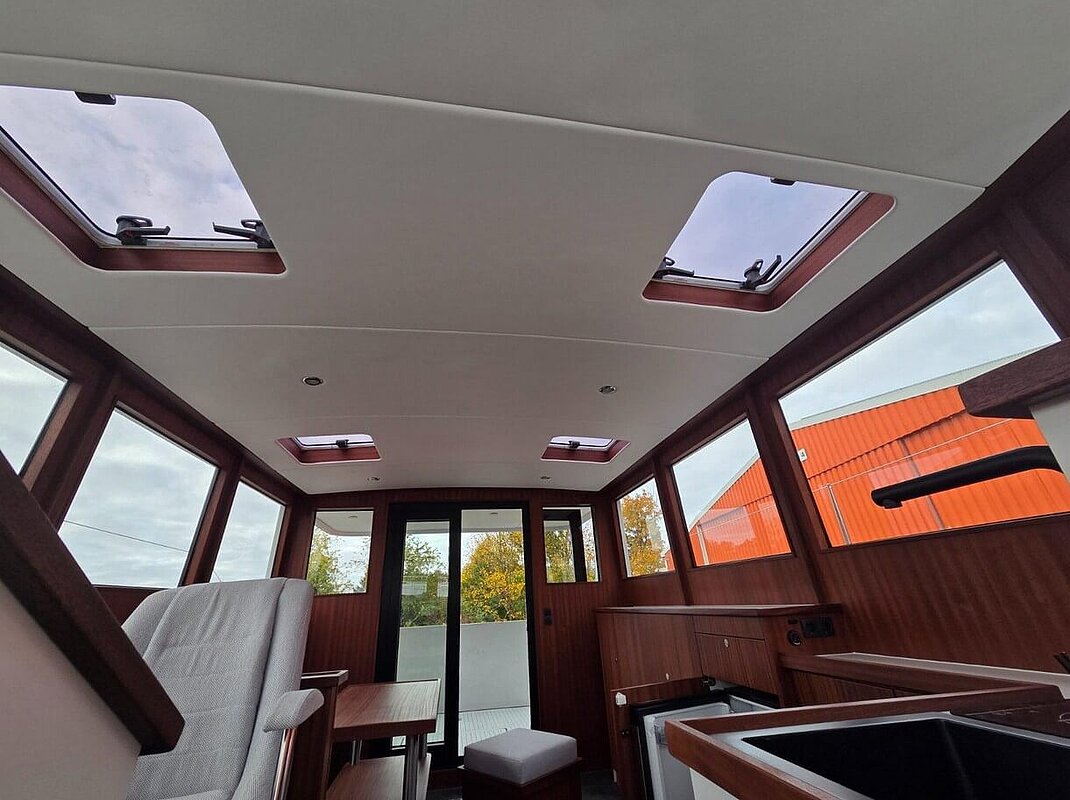 Fenster sind in Aluminiumprofilen ausgeführt, alle mit Einfachglas in Securit Sicherheitsglas, grau getönt. Dazu 3 x Luken in VK, 4 x Luken im Salon und eine doppelflügelige Alutür von der Plicht zum Salon.